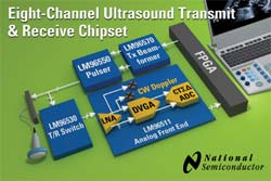 National propose un chipset émetteur/récepteur 8 canaux complet, comprenant un frontal de réception analogique (AFE), un commutateur émission/réception, un pulseur de transmission et un "beamformer" (générateur de faisceau) de transmission configurable. Ce haut niveau d’intégration permet aux concepteurs système de mettre au point des systèmes d’échographie 128 canaux ultralégers offrant une bonne qualité d’images et des fonctions de diagnostic malgré un encombrement réduit. National supporte ce chipset avec des kits d’évaluation complets, des schémas de référence, et des outils permettant aux utilisateurs d’évaluer dans le détail les performances du circuit et d’accélérer le lancement des produits.