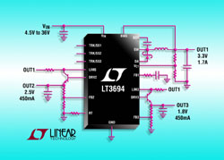 Le LT3694 offre aussi la possibilité de synchronisation de la fréquence de découpage. La version LT3694-1 est disponible si un signal de sortie d’horloge est requis pour synchroniser d’autres composants externes. Les LT3694EUFD et LT3694-1EUFD sont présentés en un boîtier QFN de 28 broches, 4 mm x 5 mm. Les LT3694EFE et LT3694-1EFE sont présentés en un boîtier TSSOP de 20 broches, à performances thermiques renforcées. Les LT3694IUFD et LT3694-1IUFD sont testés et garantis pour fonctionner avec une température de jonction de – 40°C à 125°C. Les LT3694IFE et LT3694-1IFE sont testés et garantis pour fonctionner avec une température de jonction de – 40°C à 125°C, ils sont présentés en un boîtier TSSOP de 20 broches, à performances thermiques renforcées.