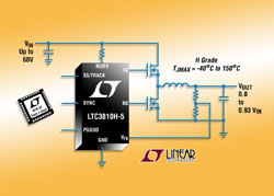 Linear Technology Corporation présente le LTC3810H-5, un contrôleur DC/DC, abaisseur, synchrone, à forte tension d’entrée, avec spécifications garanties pour une température de jonction aussi élevée que 150°C. Ce composant utilise une architecture de contrôle à mode courant de vallée constant, fournissant des rapports cycliques très faibles et une réponse extrêmement rapide aux transitoires avec une limite d’intensité précise cycle-par-cycle, sans avoir à recourir à une résistance de détection d’intensité. Ce contrôleur durci peut convertir directement des tensions de 60 V en tensions de sortie allant de 0,8 V à 93% de la tension d’entrée VIN. Les puissants pilotes de grille de MOSFET, de 1 ohm, intégrés, réduisent les pertes dues aux transitoires de commutation des MOSFET canal N, à une fréquence élevée et à une forte tension, pour des intensités jusqu’à 25 A. Les applications incluent la conversion en tension de 48 V pour les alimentations des télécommunications et des transmissions de données, ainsi que les systèmes de l’automobile et de l’industrie sensibles aux surtensions de niveau élevé.