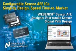 Les circuits Sensor AFE configurables, et l’outil WEBENCH® Sensor AFE Designer permettent aux ingénieurs d’études de sélectionner un capteur, de concevoir et de configurer une solution, puis de télécharger les données de configuration dans le circuit Sensor AFE. Une application de détection typique qui peut nécessiter de nombreuses cartes et 25 composants, se réduit ainsi à un seul circuit de National Semiconductor. Les semaines ou mois de travail nécessaires au développement d’un projet capteur se voient réduits à quelques minutes grâce aux produits et outils de National.