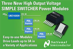 National Semiconductor Corp. (NYSE : NSM) présente trois nouveaux modules de puissance SIMPLE SWITCHER®, le premier pour piloter des applications haute tension dans différents domaines comme l’industrie, les infrastructures de communication, ou le militaire. Les modules d’alimentation facile à utiliser LMZ14201H, LMZ14202H et LMZ14203H offrent le rendement d’un régulateur à découpage, et la simplicité d’un régulateur linéaire, en éliminant l’inducteur externe et la complexité d’implantation typique des designs à régulateur à découpage.