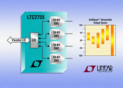 Le LT2755-16 garantit une linéarité de 16 bits (INL et une DNL de ± 1 LSB (max.)), sur la gamme de températures industrielles, sans réglages. Chaque sortie du CNA peut être programmée séparément par une interface parallèle ou fonctionner sur une seule gamme par connexion de broches.