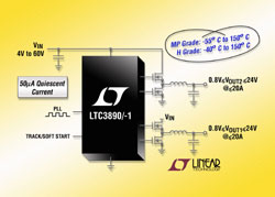 Ce contrôleur DC/DC, abaisseur, synchrone, de forte tension, à deux sorties, ne consomme que 50 µA avec une sortie active et 60 µA lorsque les deux sorties sont actives. La gamme de tensions d’entrée, de 4 V à 60 V, constitue une protection contre les impulsions de forte tension, permet d’assurer le fonctionnement dans les conditions de démarrage à froid pour l’automobile, et couvre une large gamme de sources d’alimentation d’entrée et d’éléments de batterie de différentes constitutions chimiques. Chacune des tensions de sortie peut être réglée entre 0,8 V et 24 V, pour des intensités de sortie jusqu’à 20 A, avec des rendements pouvant atteindre 95%, ce qui fait que le LTC3890/-1 convienne pour l’alimentation des systèmes de l’automobile de 12 V ou 24 V, des équipements lourds, du contrôle industriel, des applications de la robotique et des télécommunications. Ces versions de classes H et MP sont garanties pour fonctionner avec une température de jonction, respectivement, de - 40°C à 150°C et – 55°C à 150°C.