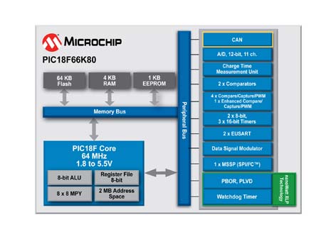 Pour les applications automobiles et industrielles, les microcontrôleurs CAN PIC18F K80, grâce au périphérique CAN intégré, permettent un meilleur contrôle, à un bon rapport coût/efficacité. Pour les applications exigeant une faible consommation et une haute précision, ces microcontrôleurs offrent les meilleures valeurs nominales du marché pour une meilleure durée de vie des batteries, ainsi qu’un CAN 12 bits intégré et un périphérique tactile pour capteurs avancés.