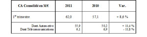 La branche Télécommunications a généré un chiffre d’affaires au 1er trimestre 2011, de 6,1 M€, en retrait de 11,8 %. Cette activité qui a fait l’objet d’un plan de réorganisation au second semestre 2010 est désormais concentrée sur des marchés à forte valeur ajoutée.
