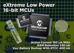 Certaines applications exigent que la durée de vie des batteries soit à peu de chose près identique à celle du produit fini. Grâce à un courant de fonctionnement de 150 microampères/MHz, à de nombreux modes faible consommation et à un mode veille faible consommation avec conservation du contenu de la RAM pour 330 nA, les microcontrôleurs PIC24F « GA3 », en réduisant la consommation globale de l’application, permettent de maximiser la durée de vie des batteries. Pour permettre à l’horloge temps réel de continuer à fonctionner quand l’alimentation primaire est coupée, une broche VBAT peut être utilisée pour alimenter la batterie de secours avec une consommation de 400 nA. En outre, la transition de VDD vers la broche d’alimentation VBAT se fait automatiquement lorsque VDD est coupée. Le contrôleur d’affichage LCD intégré offre la possibilité de piloter directement jusqu’à 480 segments, avec 8 lignes communes, ce qui permet des afficheurs plus clairs et plus souples, incluant des possibilités telles que des icônes explicites ou le défilement du texte.