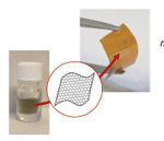Actuellement, plusieurs voies de synthèse du graphène existent. L’une d’elles permet de le produire sous la forme d’une solution de particules de quelques centaines de nanomètres de diamètre, stabilisées dans l’eau par des tensioactifs4. Pour obtenir cette « encre conductrice », la voie de synthèse utilisée permet de ne sélectionner que des feuillets monocouches qui assurent des propriétés électroniques remarquables5 (et non un mélange de graphène monocouche et multicouche). Autre spécificité : la production de composants peut s’effectuer sur des supports très variés tels que du verre, du papier ou encore un substrat organique. Des chercheurs du CEA, du CNRS, de l’Université Lille 1 et de l’Université de Northwestern ont, pour la première fois, élaboré un procédé original de fabrication de transistors flexibles à partir de graphène solubilisé, sur des substrats de polyimide (polymère thermostable). Ils ont ensuite étudié de manière approfondie leurs performances haute-fréquence.