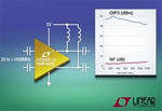 Un amplificateur de gain 15dB, qui atteint une large gamme dynamique, chargé en différentiel par 100ohms, de 20MHz à 1GHz et au-delà. Il est disponible en deux grades de performances : à 240MHz, l’OIP3 du grade A est typiquement de 50dBm et est entièrement testé et garanti pour atteindre au minimum 47dBm. La figure de bruit est de 3dB, ce qui correspond à un niveau de bruit de l’amplificateur de 1nV/Hz, référencé à la tension d’entrée. La consommation en continu est de 800mW. Cette combinaison d’un faible niveau de bruit et d’une faible distorsion offre la large gamme dynamique nécessaire aux applications, de performances élevées, des télécommunications de fréquence intermédiaire et de télévision par câble (CATV).