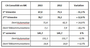 Au 2ème trimestre 2013, ACTIA Group a réalisé un chiffre d’affaires de 78,7 M€, en hausse de 12,0 % par rapport au 2ème trimestre 2012. Cette bonne performance trimestrielle est portée par la branche Automotive qui renoue avec la croissance.