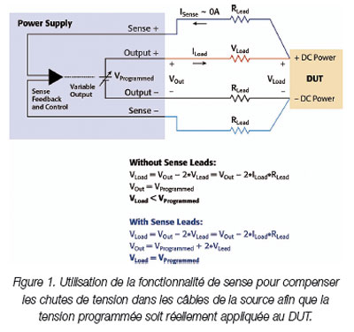 La solution est d’utiliser la fonctionnalité de sense sur l’alimentation. Elle renvoie la tension mesurée au niveau du DUT au circuit de régulation de l’alimentation. Le circuit de détection d’erreurs de l’alimentation détecte que la tension est inférieure à la tension programmée. Le circuit de commande régule la tension de sortie et l’augmente pour compenser les chutes de tension dans les câbles. La fonctionnalité de sense fait en sorte que la tension de programmation soit appliquée avec précision au DUT. Les câbles de sense sont connectés à un circuit de mesure à haute impédance d’entrée ; il existe donc une chute de tension négligeable dans les câbles de test, ce qui veut dire que les câbles de sense n’introduisent pas d’erreur détectable dans la boucle de renvoi. La Figure 1 montre le calcul de la tension au DUT avec et sans câbles de sense. Si le contrôle de la tension appliquée au DUT est critique pour la caractérisation et le test, assurez- vous que l’alimentation ait la précision de sortie requise. Toutefois, ne perdez pas de la précision en sélectionnant une alimentation sans fonctionnalité de sense.