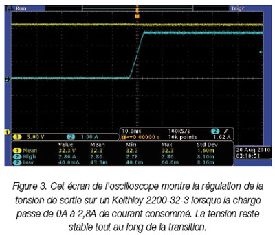 Vous voulez que votre sortie maintienne son niveau en cas de variation de la charge. Vous avez également besoin que l’alimentation fournisse des transitions contrôlées (reste régulée) si la charge varie. Si vous utilisez le modèle Keithley 2200-32-3 avec une régulation de charge de tension de <0,01% + 2 mV, la sortie devrait rester dans les 5,2mV pour 32V, puissance maximale lorsque la charge passe de 0A au courant de sortie maximal soit 3A. Vous pouvez également évaluer une alimentation pour vérifier qu’elle réponde à cette exigence pour votre DUT en fonction de la manière dont les changements de charge se produisent dans votre DUT. Vous ne voulez pas voir de phénomènes transitoires en tension du type dips ou spikes qui pourraient endommager votre DUT. La Figure 3 montre la réponse contrôlée du modèle Keithley 2200-32-3 à un changement de charge.