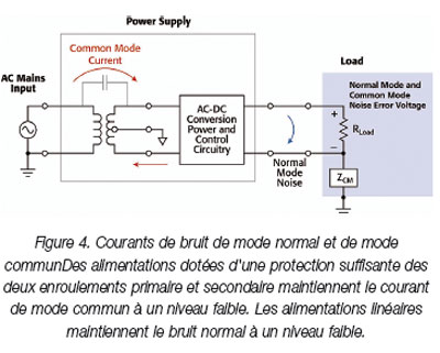 Un détail qui peut ne pas être précisé est le bruit de mode commun, bruit lié au couplage du courant AC parasite sur les enroulements du transformateur d’isolation de l’alimentation. Ce courant circulant dans la charge du DUT va créer une tension de bruit qui pourrait dégrader les performances du DUT. Voir Figure 4.