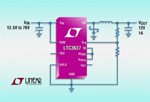 Un convertisseur abaisseur, de fort rendement, pouvant accepter 76V en entrée et fournir un courant continu de sortie jusqu’à 1A. Il fonctionne à partir d’une gamme de tensions d’entrée de 4V à 76V, de ce fait il convient aux applications des télécommunications, de l’industrie, de l’avionique et de l’automobile. Le LTC3637 fonctionne en mode courant crête, programmable, afin d’optimiser le rendement sur une large gamme d’intensités de sortie. Il peut réaliser des rendements aussi élevés que 90% et requiert un courant de repos de seulement 12µA, ce qui optimise l’autonomie sur batterie. Une fonction de limitation du courant de sortie, programmable par l’utilisateur, peut fixer l’intensité de sortie entre 100mA et 1A, selon les demandes de l’application.