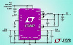 Le LT3667 requiert un courant de repos de seulement 50µA lorsque les trois canaux sont en mode régulation, ce qui le rend approprié pour les applications toujours sous tension de l’automobile. La fréquence de commutation du LT3667 est programmable par l’utilisateur, de 250kHz à 2,2MHz, ce qui permet au concepteur d’optimiser le rendement tout en évitant les bandes de fréquences critiques, sensibles au bruit. Chacun des régulateurs LDO a une limite de courant programmable jusqu’à 200mA, ce qui offre un niveau complémentaire de fiabilité. Bien que les régulateurs LDO puissent être alimentées par des entrées indépendantes, les alimenter à partir de la sortie du commutateur principal assure à la fois un haut rendement et un faible niveau de bruit. La combinaison de son boîtier QFN-24 (ou MSOP-16E, thermiquement renforcé) et de sa fréquence de commutation élevée qui permet l’emploi de petits condensateurs et inductance, externes, conduit à une empreinte très compacte et de bon rendement thermique.