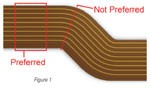 Moyennant une certaine connaissance du processus de fabrication, les ingénieurs peuvent en toute confiance se lancer dans la conception de PCB flexibles, mais il y a plusieurs aspects de la conception de circuits, tout en n’étant pas immédiatement évidents, peuvent avoir un impact négatif sur les conceptions nouvelles. Par exemple, les angles à 45 degrés (ou même à 90 degrés) sont largement utilisés dans la conception de PCB rigides, mais doivent être évités dans les zones où sont employés des substrats flexibles. Lorsqu’un changement de direction est inévitable, le mode coin en arc de cercle doit être utilisé, car il peut réduire la contrainte mécanique lors de la flexion (figure 1).