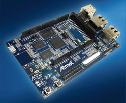Ce kit permet aux développeurs d’évaluer facilement les fonctions avancées du processeur SAMA5D3. La carte est équipée de 256 Mo de DDR2 DRAM, 256 Mo de flash NAND, d’un connecteur pour carte SD et d’un connecteur microSD™. Le connecteur pour interface LCD est géré par un contrôleur LCD TFT tactile. Deux ports Ethernet sont disponibles, un pour 10/100 et un pour Gigabit Ethernet. Il y a aussi deux ports USB hôte et un port USB micro-AB. Enfin, la carte dispose d’emplacements d’extension compatibles Arduino-R3 pour la connexion de shields Arduino™.