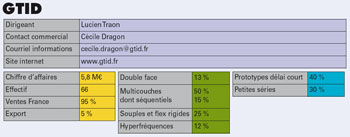 Par le biais de conventions d’affaires à l’étranger ou de salons internationaux, le groupe GTID souhaite développer son offre de circuits imprimés de technologie spécifique et mixte : hyperfréquence, d’électronique de puissance (transfo-planars), flexrigide >classe 6. En complément des investissements matériels à hauteur de 5% en 2013, le groupe gtid a investi en matière de R&D pour ses activités électroniques avec une progression de 30% pour l’année 2013. Ceci est dû principalement à la participation à 2 programmes. Le projet Denoteic – échéance en 2014 - a été mis en oeuvre en prévision de l’explosion de marché des objets communicants touchant les composants de base des systèmes hyperfréquence, antennes, filtres, fonctions nécessaires à l’émission-réception d’un signal. Cette collaboration a permis à Gtid de rassembler les compétences des intervenants industriels et académiques concernés par ces nouveaux procédés et circuits imprimés. Le Projet européen Midimu touche au développement à la qualification de circuits imprimés type HDI et hyperfréquence (intégration sur un même substrat de bga fine pitch et de filtres passe-bande enterrés) Courant 2013, le groupe GTID a également intégré la plate-forme collaborative MEREDIT rassemblant les fabricants français de circuits imprimés.