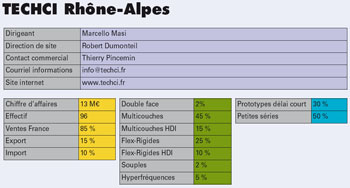 Techci Rhône-Alpes met le cap sur l’Europe. Techci Rhône-Alpes renforce sa stratégie en définissant une politique basée sur la croissance aussi bien en France qu’à l’internationale. Cette croissance s’appuie sur une offre technologique complète, pour s’adapter et répondre au Marché, toujours plus exigeant en terme de demande technologique, réactivité, compétitivité. La haute technologie des cartes électroniques demande des circuits imprimés de plus en plus complexes, intégrant les technologies HDI aux multicouches et aux flex rigides.. aussi bien pour des applications industrielles, aéronautiques ou militaires. Techci Rhône-Alpes , au sein de la division PCB du groupe FINMASI, continue ses investissements (à hauteur d’un million d’euros en 2014) dans des machines qui amélioreront encore plus la qualité des produits, la productivité , la flexibilité. Parmi les grands axes d’amélioration, le positionnement de l’imagerie pour une meilleure résolution, une nouvelle ligne de gravure pour les couches externes et l’automatisation de tâches manuelles répétitives pour réduire la pénibilité du travail, tout en augmentant la productivité.
