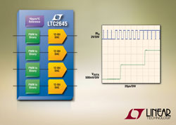 Linear Technology Corporation présente la famille LTC2645 de convertisseurs numériques-analogiques (CNA), de 4 canaux PWM, 8bits / 10bits / 12bits, sorties en tension, avec une référence de tension à 10ppm/°C. Ces versions convertissent des signaux d’entrée PWM en sorties en tension, 12bits, tamponnées, stables et précises, en moins de 8µs, ce qui élimine l’ondulation et le retard typiquement associés aux filtres analogiques.