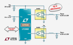 Le composant combine les performances, les meilleures de sa classe, pour un régulateur analogique à découpage avec acquisition précise de données mixées, une précision de ± 0,50% de la tension de sortie DC sur la gamme de températures, une relecture du courant précise à ±1%, un CAN delta sigma de 16bits et une EEPROM. Il fonctionne à partir d’une alimentation de 3V à 13,2V, et est conçu pour une conversion de la tension d’entrée VIN , de 3V à 38V, en des tensions de sortie de 0,5V à 5,25V. Le partage du courant entre les deux canaux est précis, à la fois à l’état stable ou en fonctionnement transitoire. Jusqu’à quatre LTC3882 peuvent être mis en parallèle pour un fonctionnement à 2, 3, 4, 6 ou 8 phases.