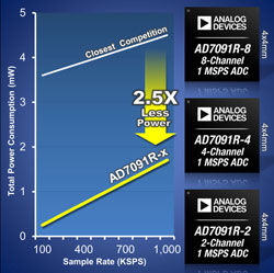 Ces nouveaux convertisseurs analogique/numérique sont les plus économes en énergie de leur catégorie, dissipant au maximum 1,7 mW à la fréquence d’échantillonnage de 1 Méga-échantillons par seconde (Méch/s), soit plus de 60 % d’énergie en moins que leur concurrent le plus proche. Montés en boîtier LFCSP miniature de 4 x 4 mm, ces convertisseurs analogique/numérique embarquent une référence interne de 5 ppm/°C typique.