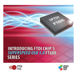 Les FT600Q et FT601Q de FTDI Chip sont des produits USB 3.0 de première génération, fonctionnant comme des ponts USB 3.0 Superspeed vers FIFO, offrant des débits en rafales pouvant atteindre 3.2 Gbits/s. Le FT600Q se présente en boîtier QFN 56 broches, et dispose d’une interface de bus FIFO de largeur 16 bits, tandis que le FT601Q se présente en boîtier QFN 76 broches, et dispose d’une interface de bus FIFO de largeur 32 bits. Ces deux puces supportent jusqu’à 8 points terminaux, en plus des points terminaux de gestion. Ces points terminaux sont reliés à des buffers configurables de 16 koctets côté IN, et 16 koctets côté OUT.