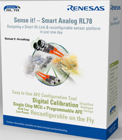 Le RL78/G1E est un composant multi-chip package (MCP) qui intègre un bloc Smart Analog et un bloc microcontrôleur 16 bits à consommation ultra faible ; le tout est réuni dans un unique boîtier. Le bloc analogique comprend un ensemble de circuits analogiques frontaux destinés au traitement des petits signaux issus des capteurs tels des amplificateurs opérationnels configurable, un amplificateur à gain ajustable, des filtres passe-haut/passe-bas, des convertisseurs N/A 8 bits et un capteur de température. Le block MCU est basé sur le RL78/G1A qui bénéficie d’une large quantité (des kilo-octets) de mémoire flash pour les données et de convertisseurs A/N 12 bits de haute précision.