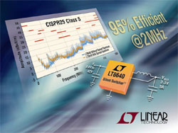 Une architecture unique Silent SwitcherTM, associée à une modulation de fréquence à étalement de spectre, réduit les émissions dues aux interférences électromagnétiques / à la compatibilité électromagnétique (EMI/EMC) de plus de 25dB, même avec des fréquences de découpage supérieures à 2MHz, lui permettant d’être au-dessous des limites crêtes de la norme CISPR 25 Classe 5 de l’automobile. Le redressement synchrone fournit un rendement aussi élevé que 95%, à une fréquence de découpage de 2MHz. Sa gamme de tensions d’entrée, de 3,4V à 42V, le rend approprié aux applications de l’automobile et de l’industrie.
