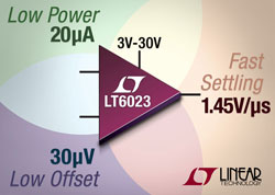 Linear Technology présente le LT6023, un amplificateur opérationnel double, 3V à 30V, de faible consommation, présentant un décalage de zéro de tension d’entrée de 30µV max. et une stabilisation en 60µs à 0,01%. Un circuit propriétaire d’amélioration du balayage procure une réponse rapide et nette à un échelon en sortie avec une faible consommation. Un circuit d’entrée, conçu spécialement, maintient une haute impédance, ce qui réduit les pics d’intensité associés aux échelons rapides pour des échelons d’entrée jusqu’à 5V. Toutes ces caractéristiques réunies rendent le LT6023 approprié pour les instruments portatifs de grande précision, les systèmes d’acquisition de données multiplexés et les applications d’amplificateur tampon pour CNA.
