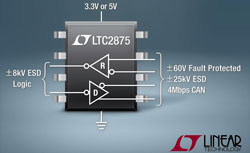 Linear Technology Corporation présente le LTC2875, un émetteur-récepteur CAN (réseau local de contrôle), d’une exceptionnelle robustesse, acceptant de fortes tensions, conçu pour réduire fortement les défaillances sans avoir recours à des composants de protection, externes, chers. Dans les systèmes CAN, les pannes dues au câblage croisé lors de l’installation, les pannes dues au défaut de masse ou des crêtes de tension induite peuvent être à l’origine de surtensions qui peuvent dépasser les performances maximales absolues des émetteurs-récepteurs habituels.