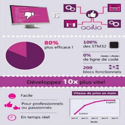 Agilia : Cet environnement de programmation graphique basé sur le concept de moteur d’instanciation, accélère fortement le développement d’une application embarquée. Vous cliquez-déposez des blocs fonctionnels sur vos pages de programmation et vous les reliez entre eux par des liens. Vous programmez rapidement de manière incrémentale en déboguant en temps réel sur votre cible STM32 ou directement en utilisant le simulateur sur votre PC.