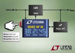 Linear Technology Corporation présente le LTC2956, une minuterie de réveil avec contrôle par bouton-poussoir, capable de gérer des alimentations de systèmes alimentés de 1,5V à 36V. L’utilisation de microcontrôleurs ou d’horloges, en temps, réel pour le suivi de la temporisation complique d’avantage de nombreuses conceptions. Les composants électroniques utilisés pour réaliser les tâches de routine, comme la gestion de la température du corps humain, la gestion des contraintes dans un pont ou la capture des images, profitent des options de réglage de la minuterie, sans avoir besoin de programmer des composants ou d’améliorer des microprogrammes.