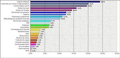 Le logiciel embarqué, au cœur de la numérisation des produits, reste sans surprise, le sujet le plus suivi (24%) lors des séminaires. Viennent ensuite les sujets traitant de la conformité aux normes et aux réglementations (20%) qui portent notamment sur le marquage CE et la Compatibilité Electromagnétique (CEM) et qui conditionnent directement une mise sur le marché réussie.