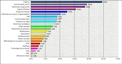 De la même manière, la gestion de projet (16%) qui porte sur la prise en compte de spécificités marché ou sur la gestion multi-compétences des projets d’objets connectés est également une thématique forte. La communication sans fil (20%) très souvent associée à des problématiques de gestion de l’énergie (14%), de capteurs (12%) et des microcontrôleurs associés (électronique programmée) est très présente, tout comme les interfaces homme-machine (IHM), la robotique et les automatismes.