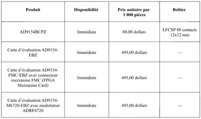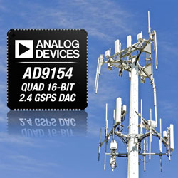 Le convertisseur numérique/analogique 16 bits 4 voies AD9154 élargit les capacités de transmission d’ADI à la gamme de fréquences comprise entre 100 et 300 MHz. Il vient s’ajouter au convertisseur numérique/analogique 16 bits 4 voies qui fonctionne dans la plage comprise entre le continu et 100 MHz, et sera rejoint courant en 2015 par un convertisseur numérique/analogique 16 bits 2 voies.