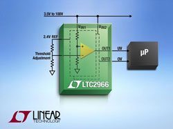 En plus des entrées de haute tension, les LTC2965- LTC2966 possèdent un comparateur à sorties à polarité réglable UV/OV, qui peuvent être forcées à des tensions aussi hautes que 100V. Toutes les broches de forte tension sont conçues pour des tensions de 140V, résistant à de fortes surtensions, sans dommage. Des diviseurs résistifs de forte valeur, avec choix du rapport, offrent une précision meilleure, une économie de puissance et une souplesse par rapport aux solutions qui utilisent des résistances externes de grande valeur. La programmation des seuils est réalisée via des résistances discrètes, de faibles valeurs, en combinaison avec la configuration des broches, pour déterminer les seuils du comparateur et fixer la polarité de la tension de sortie.