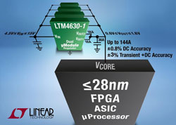Linear Technology Corporation présente le LTM4630-1, un régulateur µModule® (micromodule), double 18A ou simple 36A, procurant une régulation de la tension de sortie de grande précision, pour les FPGA, les ASIC et les microprocesseurs à architecture de 28nm et inférieure. La tension du cœur de ces composants numériques de pointe requiert une régulation très précise de la tension continue (DC) et lors de signaux transitoires rapides au niveau de la charge. Le LTM4630-1 offre une régulation précise de la tension de sortie dans deux conditions : (a) erreur totale maximum DC de ±0,8% sur l’étendue des variations de la tension de ligne, de la charge et de la température (-40°C à 125°C) et (b) erreur totale de ±3%, incluant les surtensions, avec une capacité de sortie minimum. Pour alimenter des composants numériques, à architecture de 28nm et inférieure, de puissance moyenne à élevée, on peut mettre plusieurs LTM4630-1en parallèle pour générer jusqu’à 144A de courant partagé (i.e., quatre composants x 36A). Le LTM4630-1 comprend un régulateur DC/DC, les inductances et les MOSFET, dans un boîtier BGA, 16mm x 16mm x 5,01mm.