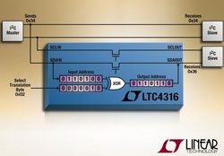 Linear Technology Corporation présente la famille LTC4316/LTC4317/LTC4318 de traducteurs d’adresses pour les systèmes à interface I2C/SMBus, qui permettent à plusieurs dispositifs esclaves de travailler sous des adresses identiques, comme les capteurs de température, pour communiquer individuellement avec le dispositif maître sans conflit. Les conflits d’adresses surgissent lorsque les dispositifs esclaves ayant la même adresse matérielle arrivent sur un même bus. Les solutions traditionnelles utilisent des multiplexeurs à interface I2C ou des commutateurs pour sélectionner par logiciel ou par broche le dispositif esclave qui a besoin d’une adresse. Les LTC4316-18 sont des solutions transparentes qui remplacent les multiplexeurs et commutateurs à interface I2C. Les LTC4316 / LTC4317 / LTC4318 ne nécessitent pas de logiciel pour la programmation ou la validation « ENABLE » des lignes de contrôle, permettant aux dispositifs maîtres d’appeler directement les dispositifs esclaves en utilisant les adresses uniques qui sont configurées par des résistances externes.
